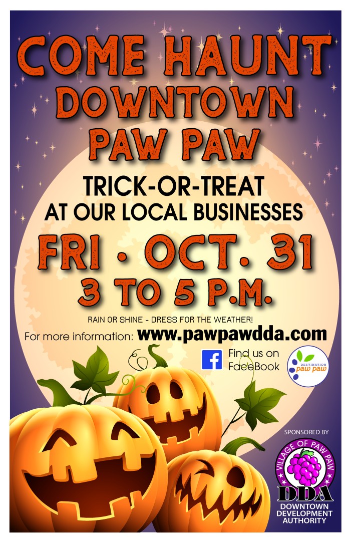 Downtown Trick or Treating put on by the Paw Paw DDA. This will happen rain or shine at the downtown Paw Paw businesses from 3:00 until 5:00. See you there!