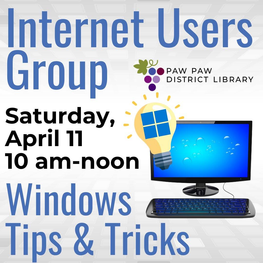 Topic: Windows Tips and Tricks Expand your technology skills while exploring fun topics with Debby Stassek. Bring your smart phones, mobile devices, and questions! This group meets the second Saturday […]